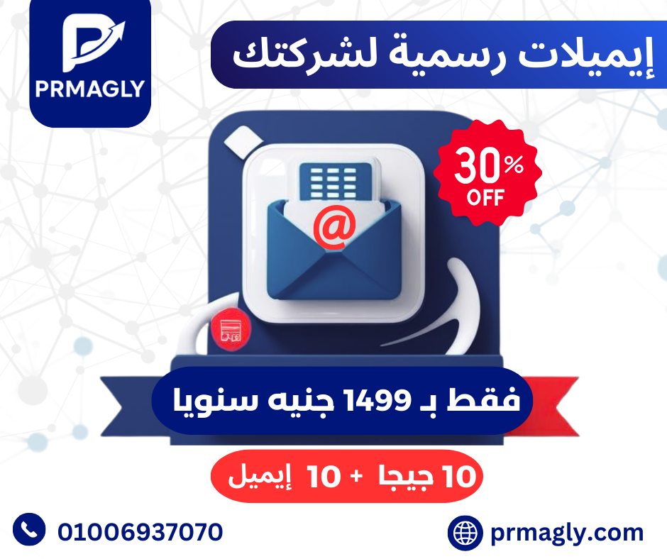 احصل على إيميل رسمي بإسم شركتك يعزز ثقة عملاءك ويزيد من احترافية أعمالك، مع مساحة 10 جيجا لكل إيميل. العرض يشمل 10 إيميل بسعر مميز.