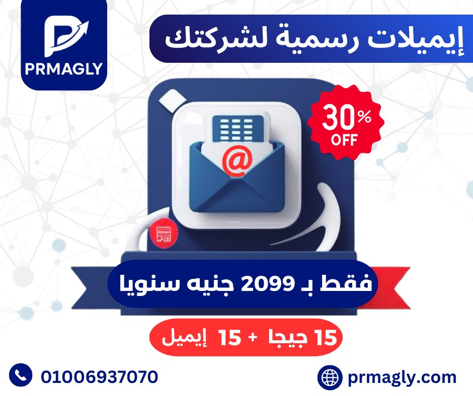 احصل على إيميل رسمي بإسم شركتك يعزز ثقة عملاءك ويزيد من احترافية أعمالك، مع مساحة 15 جيجا لكل إيميل. العرض يشمل 15 إيميل بسعر مميز.
